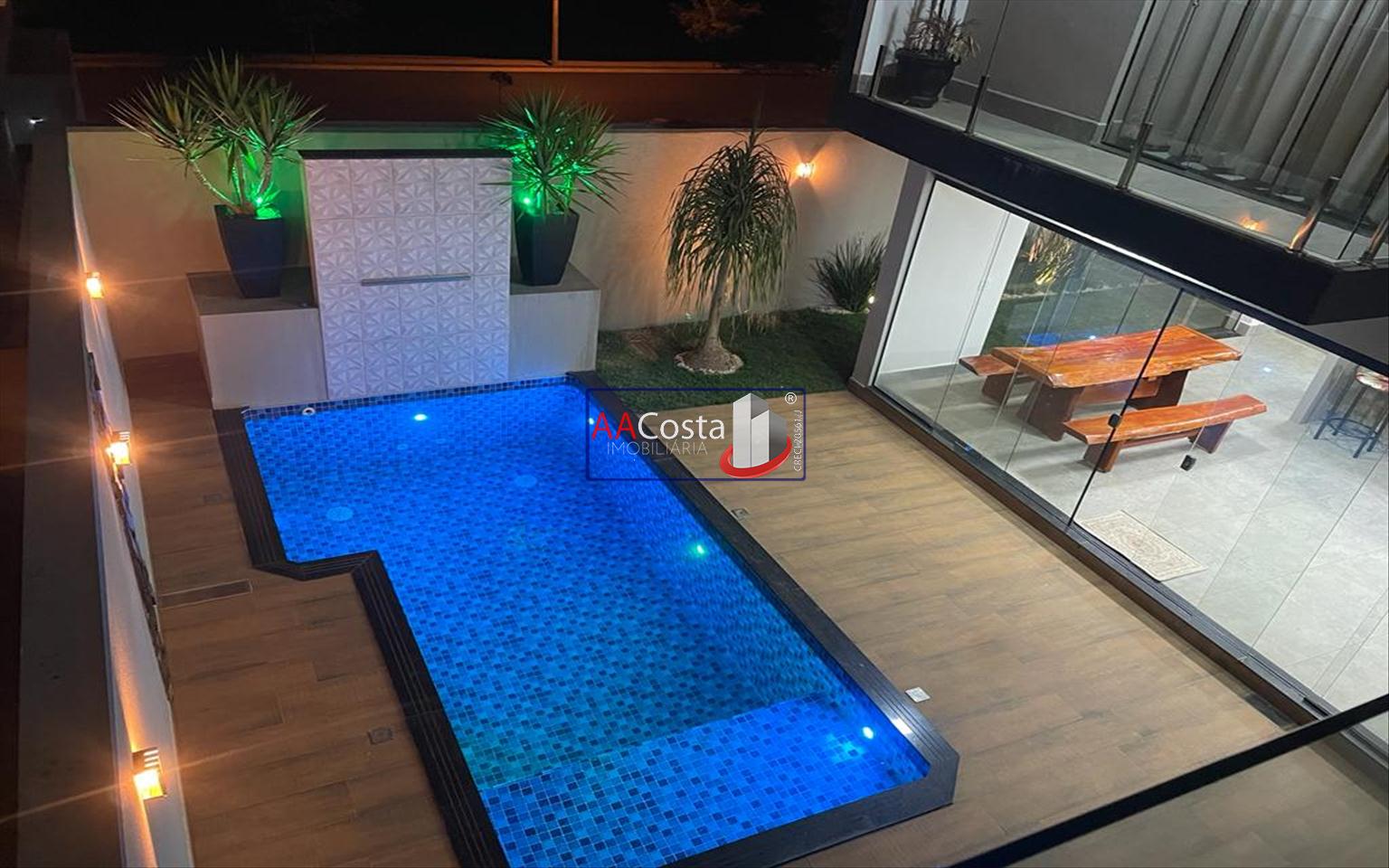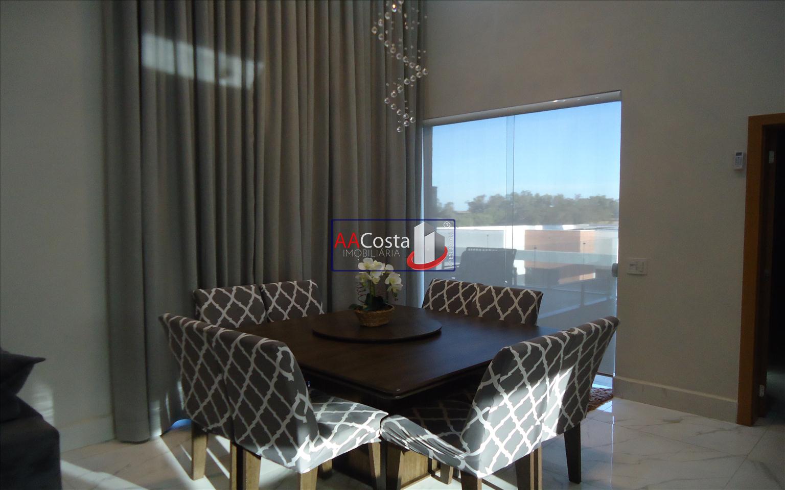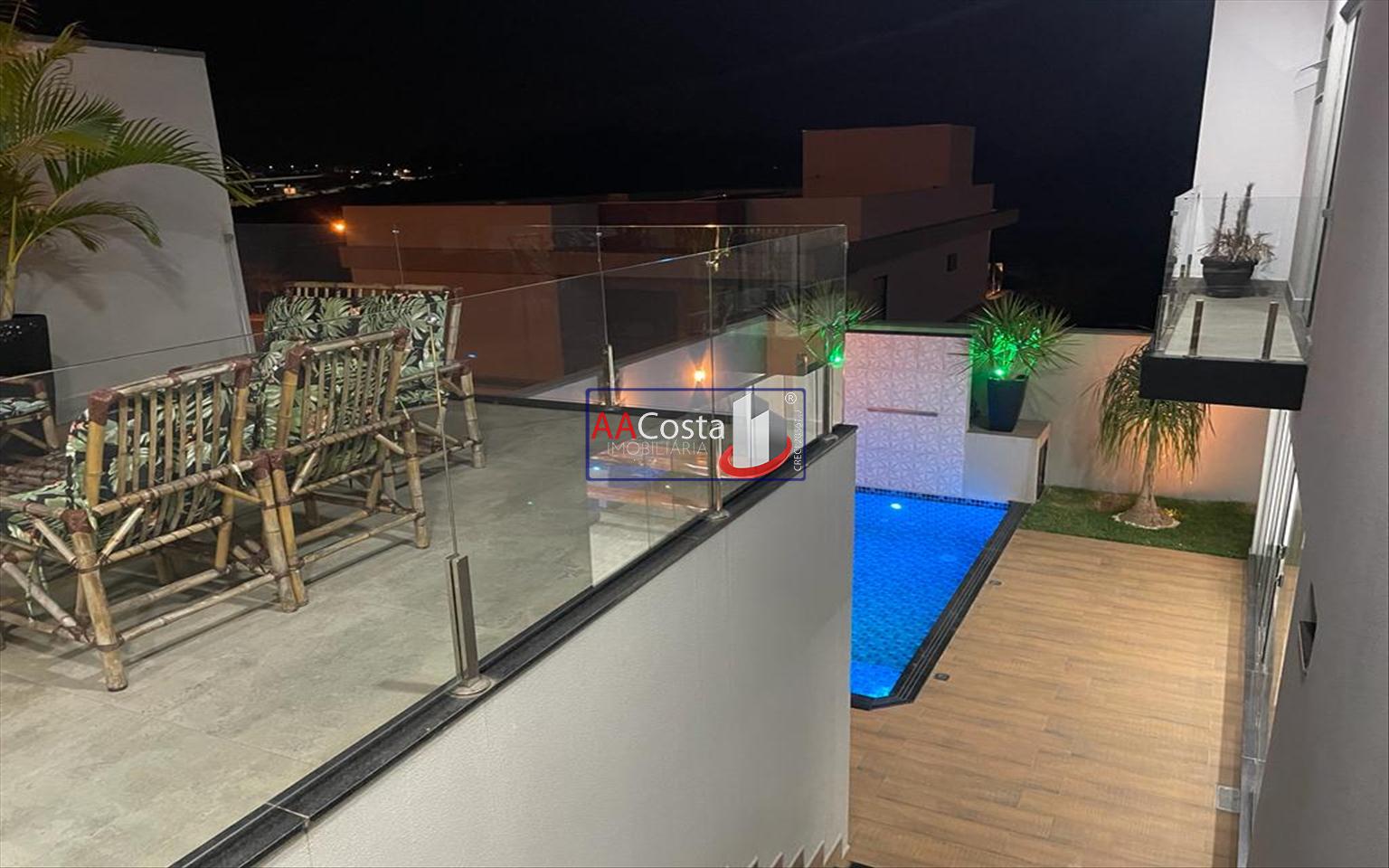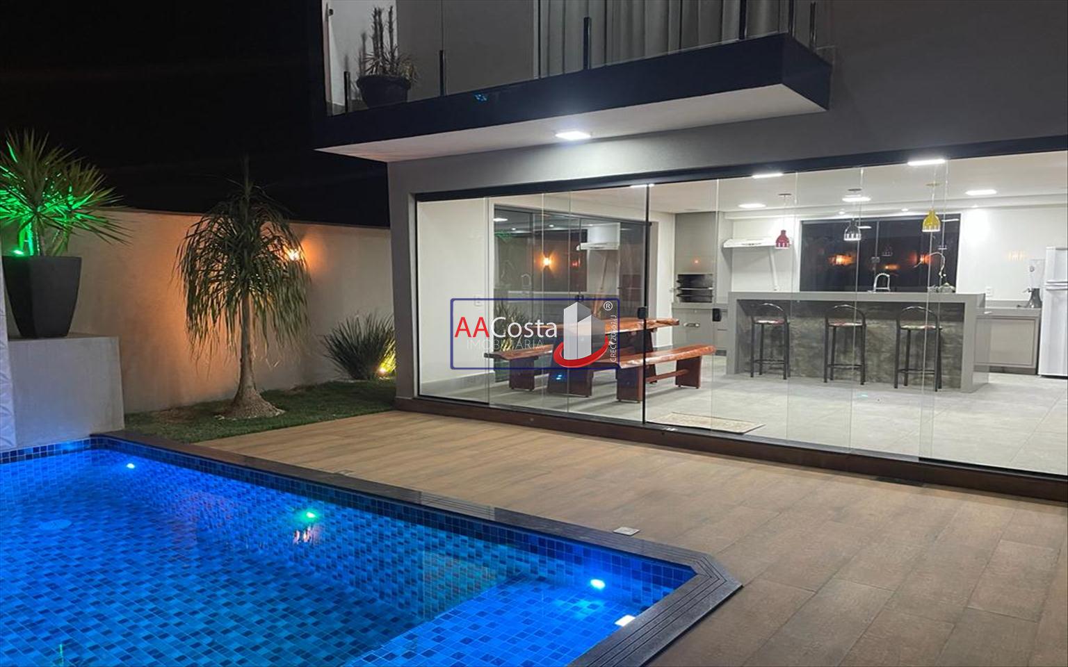 Sobrado em condomínio de alto padrão, com 04 suítes sendo uma delas a suíte master com closet e sacada, escritório, 01 lavabo, sala de TV integrada com a sala de jantar e com pé direito duplo, cozinha com armários, lavanderia com armários, área gourmet com churrasqueira, piscina aquecida e com iluminação em led, garagem coberta para 02 carros. Imóvel rico em armários e blindex, encanamento para água quente e poço artesiano.