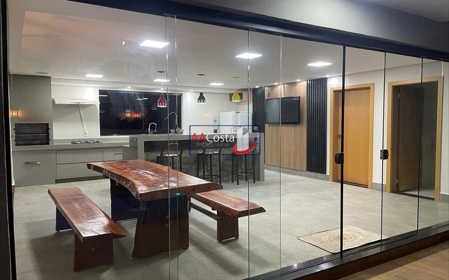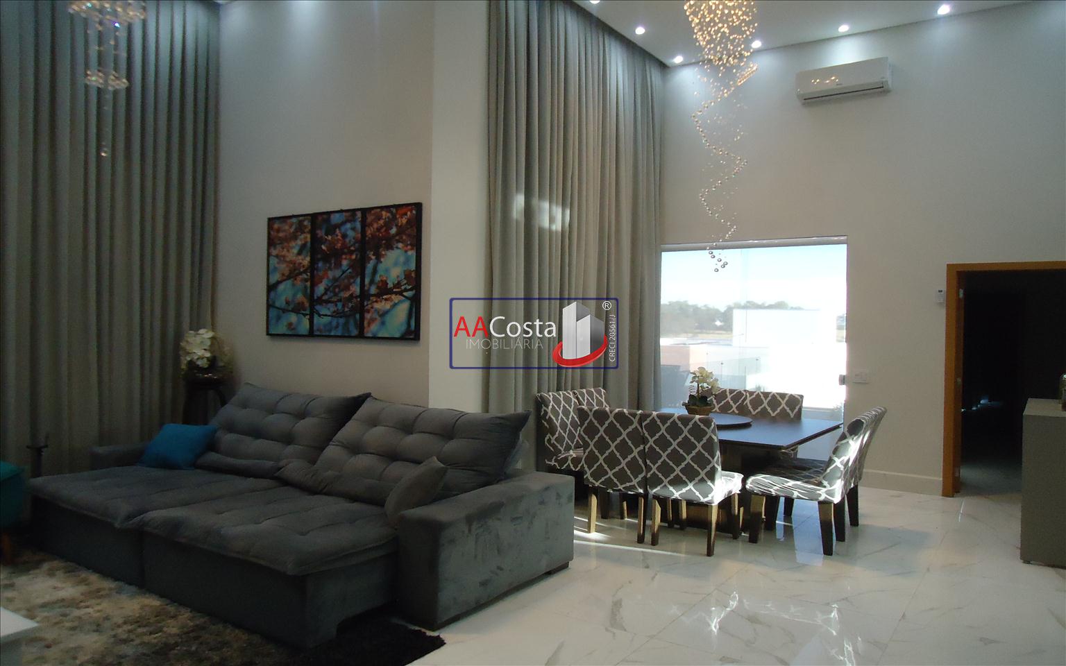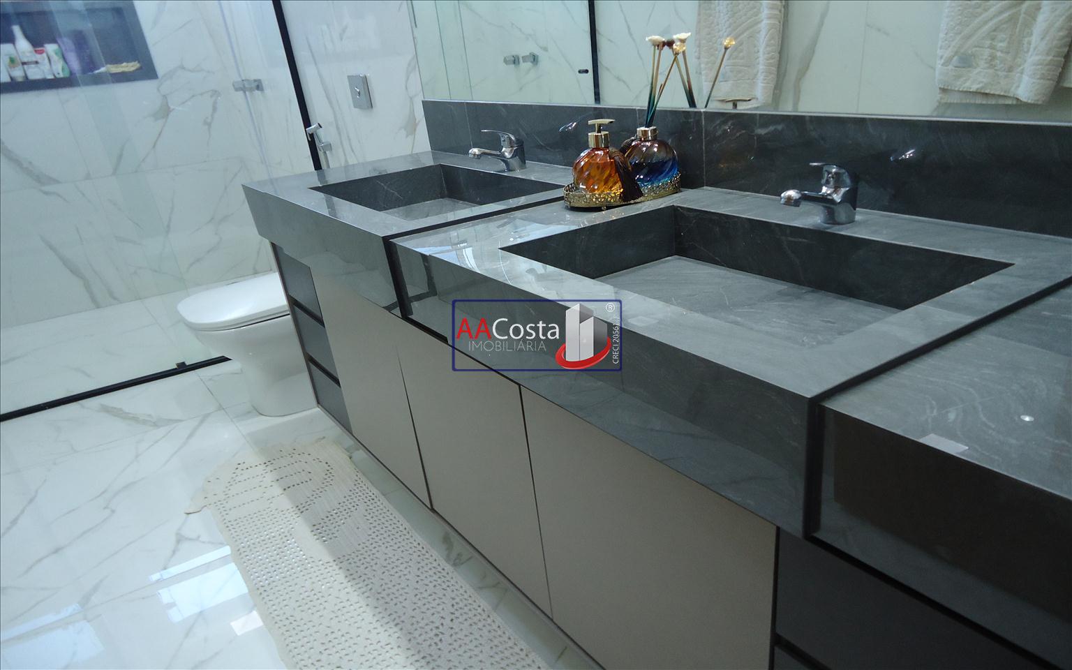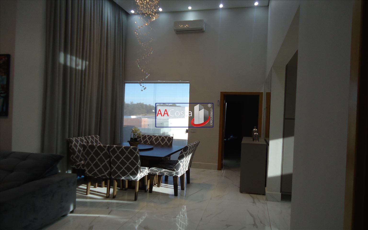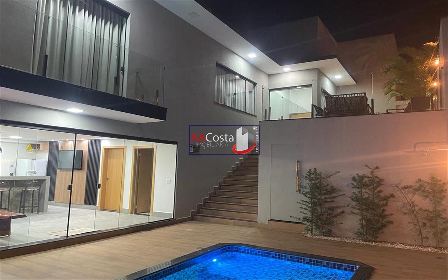 Sobrado em condomínio de alto padrão, com 04 suítes sendo uma delas a suíte master com closet e sacada, escritório, 01 lavabo, sala de TV integrada com a sala de jantar e com pé direito duplo, cozinha com armários, lavanderia com armários, área gourmet com churrasqueira, piscina aquecida e com iluminação em led, garagem coberta para 02 carros. Imóvel rico em armários e blindex, encanamento para água quente e poço artesiano.