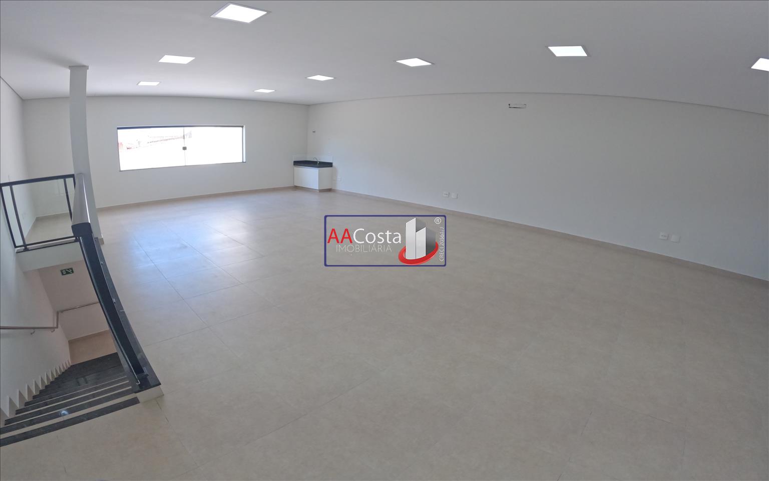 Sala comercial com 140,15 m², excelente visibilidade, mezanino, copa, banheiro acessível e área de serviço. Espaço funcional e bem distribuído.