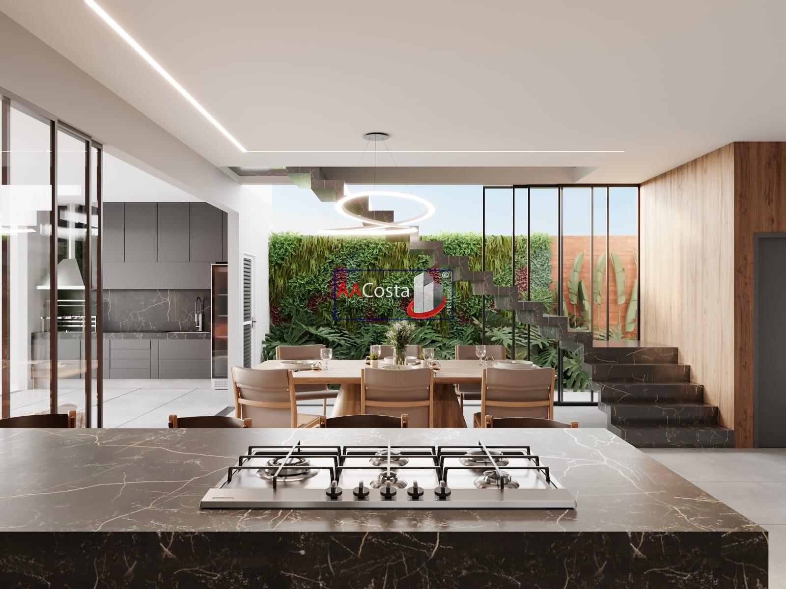 Já a parte térrea possui escritório, sala de TV, sala de jantar, cozinha, lavanderia com com ampla varanda, despensa e 01 suíte para funcionário.